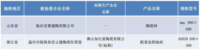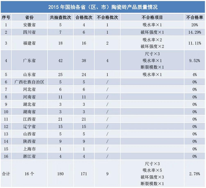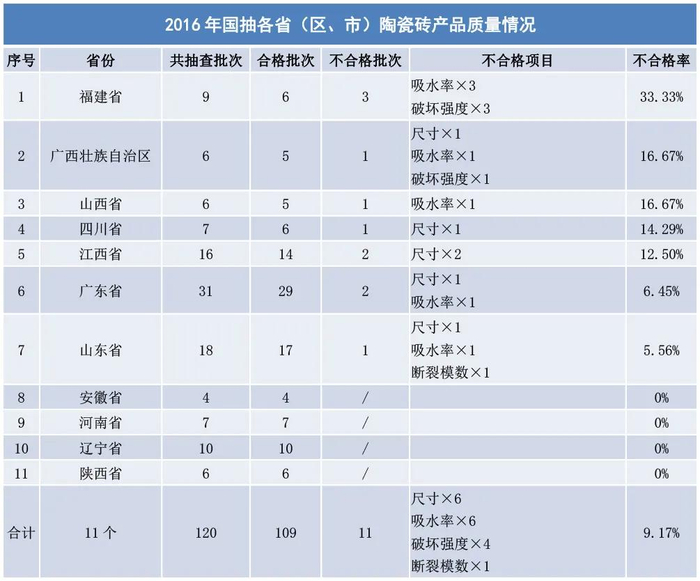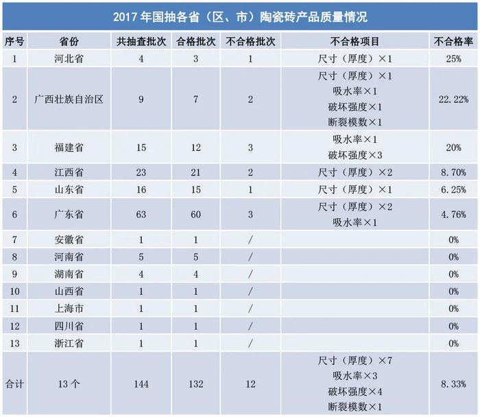 此外,另有贵州、宁夏、甘肃、四川及山西等五省抽查至少20批次瓷砖产品,合格率均为100%;广东清远于2019年12月1日发布公告“双随机”专项监督抽查情况,共抽取辖区81家企业生产的109批次陶瓷砖产品,合格率100%。