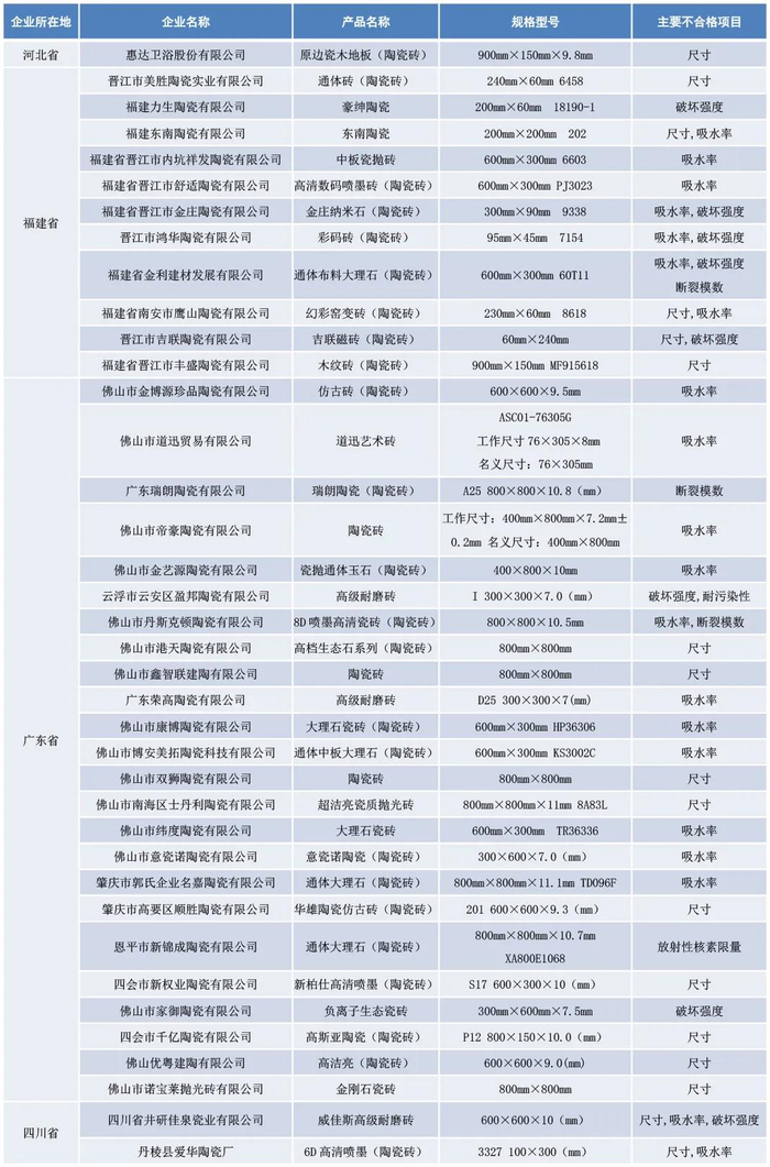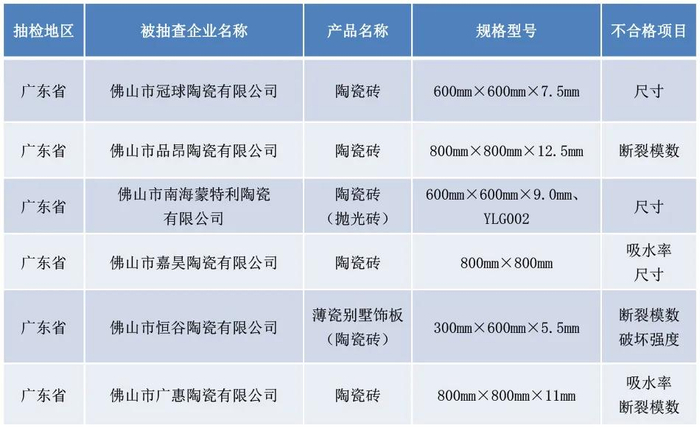 佛山市市场监督管理局发布2019年第一季度陶瓷砖抽检信息,佛山市6家企业6批次陶瓷砖在尺寸、吸水率、断裂模数及破坏强度方面不合格。