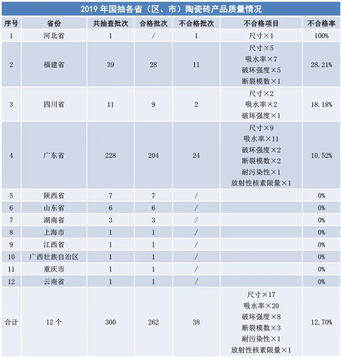 国家市场监管总局官网通报,2019年抽检的上海、河北、山东、陕西、江西、福建、广东、广西、湖南、四川、重庆、云南等12个省(区、市)297家企业生产的301批次陶瓷砖产品中,1批次产品涉嫌无证生产,38批次产品不合格,不合格发现率为12.7%,为近五年最高。