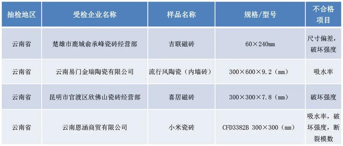 云南省市场监督管理局通报2019年陶瓷砖产品质量监督抽查情况,共抽取云南7 个州(市)30 家陶瓷生产和流通企业生产和销售的30 批次样品。其中26 家企业30 批次样品中,有4 批次样品分别在尺寸偏差、破坏强度、吸水率、断裂模数等项目上出现不合格,不合格发现率为13.33%。