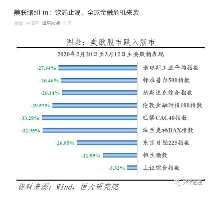 任泽平今日凌晨的最新研报认为金融危机来袭,其表示,全球金融市场雪崩,疫情只是导火索,根源是长期货币超发下的经济、金融、社会脆弱性。2008年国际金融危机至今,12年过去了,美国欧洲主要靠量化宽松和超低利率,导致资产价格泡沫、债务杠杆上升、居民财富差距拉大、社会撕裂、政治观点极端化、贸易保护主义盛行。