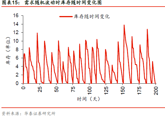 最优的(q,r)决策和任意的(q,r)决策在我们所关注的周期性上,表现是一致的,即每次进货数量都相同,但是进货时间不同。进货时间取决于随机过程的一条路径,这条路径是无法预知的,但是路径的一些性质比如均值、方差等是可以观测和度量的,最优的(q,r)决策与路径性质有关而与具体路径无关。同样的(q,r)决策在不同的随机路径下最终表现出的库存曲线不同,但拉长时间来看,进货间隔的平均时间是稳定的,在固定的进货量q下与随机过程的均值成反比。此时,库存变化也是类周期的,因为库存的进货间隔均值长期稳定,每次进货量保持一致。实际中在金融经济活动中观察到的周期也是与此类似的,多轮周期长度的均值保持稳定,但是每轮周期的路径并不一致。在周期起源首篇报告《从微观同步到宏观周期》中,我们曾经提出“周期是不确定下的稳态”的思想,本质上周期的性质就像是一种随机分布的宏观特征,拥有确定性,周期的具体形式如同随机过程中的一条路径,拥有随机性。(q,r)决策下库存变化呈现出的类周期性就恰好表达了这种性质。