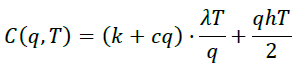 如此便证明了在需求稳定的情况下,最优的库存管理模式是定期定量进行采购,也就是订单是标准的周期行为。接下来,容易推导出库存管理过程的成本函数。库存管理的成本主要来源于两方面,一个是进货,每次进货都有一个固定成本和与进货量成正比的成本,另一个成本为库存的持有成本,与时间和库存量成正比。假设在一段较长的时间段T内,每次进货量为q,进货次数为λT/q,总成本为: