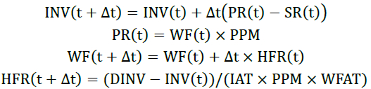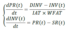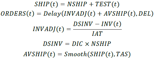 在这个过程中,可能容易迷惑的是库存调节率这个变量,实际上这个变量代表的是模型总是期望在库存调节时间内将库存调节为期望库存。基于以上的过程分析,可以写出这个库存管理模型的动力学方程,首先最主要的是库存这个状态变量的计算方程: