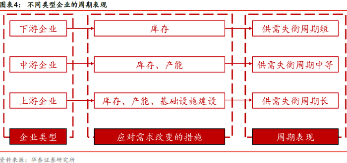虽然企业从经济循环流量图中都可以抽象为输入生产资料输出产品的函数,但是处于不同产业链上的企业对生产要素的需求不同。上游企业例如资源开采等行业更需要土地、资金等投入,服务业的核心是人力资源的投入。不同的输入输出带来了企业不同的周期表现。更需要土地等固定资产投入的产业可能更容易与建造周期相关;下游企业处于产业链末端、直接对接客户需求,可能更容易与库存周期相关;中游企业是加工制造的核心,可能更容易与产能周期相关。