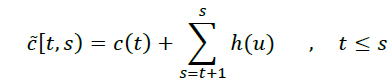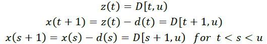 上式的意义为:t时刻的订单等于t时刻到u-1时刻的需求,t+1时刻的库存为t时刻的订单减去t时刻的需求,其余时刻的库存为前一日库存减去前一日的需求。在此情况下,成本函数k[t,u):