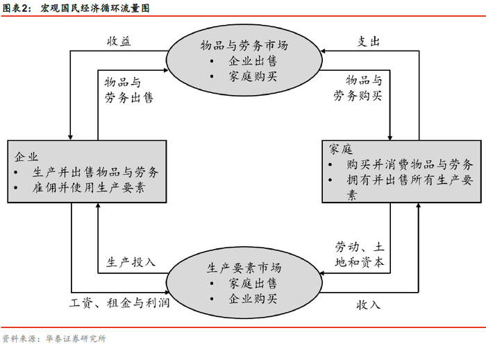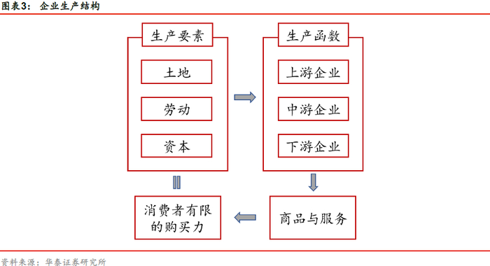 企业行为是本篇报告重点研究的基础单元。在宏观国民经济循环流量图中,企业利用劳动、土地、资本等投入来生产商品和服务。土地、资本、劳动作为生产要素归家庭所有,企业需要在生产要素市场向家庭购买,家庭则向企业购买商品和服务。如此形成了经济体的循环。对于单个企业来说,企业所有者更关心的是企业能否在生产要素市场获得生产所需的资料,同时在商品和服务市场,能够将生产的商品或服务销售出去。本质上,企业都可以抽象为输入为资本、土地、劳动等生产要素,输出为商品或服务的一个生产函数。企业的目标是生存,需要保持自身产品销售与生产要素购买这个循环的畅通,一方面需要卖出商品获取利润,另外一方面通过利润购买更多的生产要素。在与家庭发生资本交互的过程中,家庭整体的购买力是有限的,所有企业都在争夺家庭有限的购买力。企业争夺购买力获取利润保证自我循环的过程在市场经济中的表象就是谋求利润的最大化。