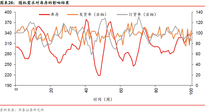 考虑测试函数为满足正态分布的白噪声,在此情况下库存也出现了类随机的振荡,但是经过库存控制系统的反馈调节之后,库存的振荡的无序程度要明显弱于需求,库存的趋势性更强,振荡周期更长。也就是说经过系统的反馈调节之后,需求的随机性在传导的过程中变弱了。这也真正体现了库存缓冲机制的作用,将随机性进行了一定的过滤。