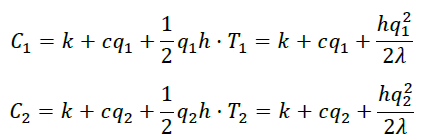关于第二条性质,每次订货的数量都是一样的,可以借助于类似均值不等式来说明。考虑两个订货周期,分别订货q1和q2。我们计算这两次进货周期的成本。两次进货可以维持需求供应的时间T1和T2如下: