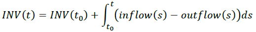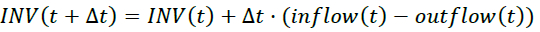 其中inflow和outflow分别代表系统的输入率(订货率)和输出率(发货率)。上式的实际意义是库存这个状态变量的值等于一段时间变化率的积分。积分方程也可以写为离散形式: