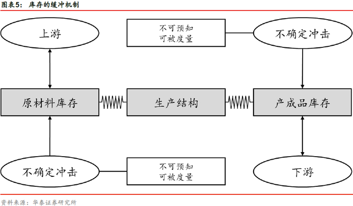 库存的调节机制、产能的调节机制、产品的更新迭代、自我管理优化都是企业为了应对不确定性所必备的能力,我们可以称其为缓冲机制。以库存为例,企业一般都有原材料库存和产成品库存,原材料库存与上游直接连接,产成品库存与下游直接连接。但两个库存与企业核心的生产结构是弹性连接,所谓弹性连接是指,外部的不确定冲击会直接反映在库存上,但是冲击会经过库存的消化缓冲,然后才会传导至生产结构。库存的结构能够对外部冲击起到一定的过滤作用,使得生产结构不至于直接被冲击,类似减震器的作用。