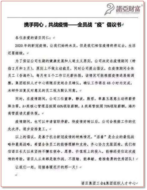 2020年,这家财富管理巨头愈发艰难。2月17日,诺亚集团工会与集团组织中心向全体员工发布降薪“战役”书,倡议高管降薪,员工无薪休假,董事长汪静波、董事殷哲和张嘉玉自愿零薪酬。
