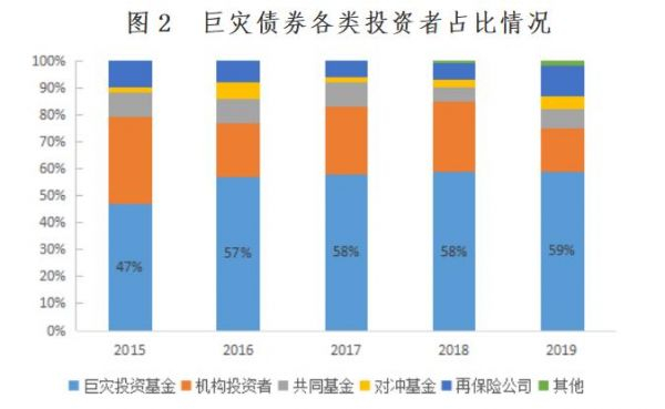投资者以非传统投资者为主,主要是专注于保险风险的巨灾投资基金。近年来,对冲基金、主权财富基金、养老金和共同基金等另类投资者所占市场份额也不断提升。据统计,2019年巨灾基金投资占巨灾债券投资规模的比重达59%,对冲基金和共同基金占比分别为11%和5%。