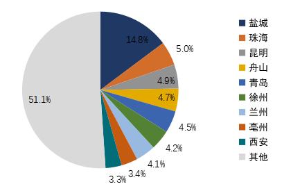 2019年,百强代表企业新增商办用地较多的城市主要有盐城、珠海、昆明、舟山等二线及三四线城市,其中长三角及珠三角区域仍是布局热点。