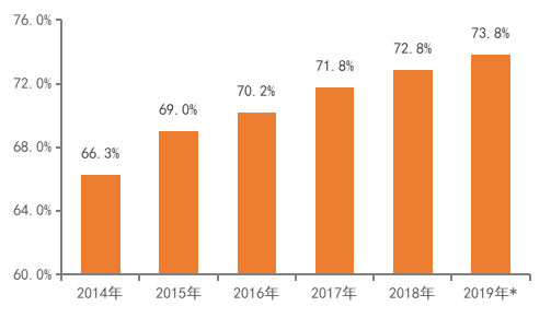 2019年商业地产百强代表企业的资产负债率均值上升至73.8%,较2018年提高1.0个百分点。尽管自2014年至今,商业地产百强代表企业的资产负债率呈持续上升态势,但商业地产企业的资产负债率尚在可控范围内。代表企业以较稳定的租金收入作为经营保障,整体仍保持稳健运行。