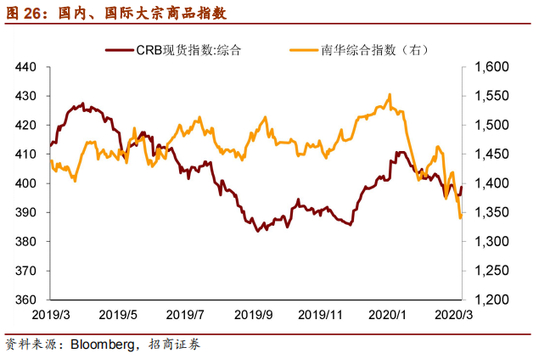 截至3月13日,CRB现货指数、南华综合指数分别较上月同期下跌0.6%、6.1%,国内商品价格跌幅显著大于海外,原因是国内能化和工业品跌幅较高。