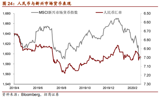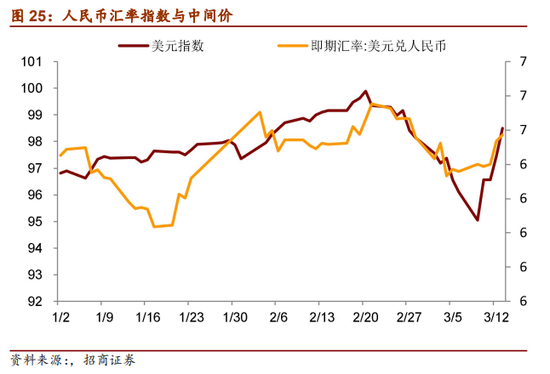 截至3月13日,人民币汇率和MSCI新兴市场货币指数分别较上月同期下行0.3%、3.0%,可见全球风险情绪恶化之时,资本回流发达国家,新兴市场货币普遍贬值。