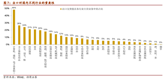 第五,全球总需求收缩对我国的影响:第一,服务贸易方面,被动因素都将外来游客人数和相关消费出现明显下降,对我国的旅游业、航空、酒店、零售等行业将产生负面影响。第二,货物贸易方面,商品价格下跌反映出海外投资、消费活动预期下降之下的全球总需求收缩。从2019年我国的出口国别结构来看,对美国、欧洲五国、日本、韩国的出口占比分别为16.8%、11.3%、5.7%、4.4%,显示美欧对我国出口的重要性较高,高于日韩。从行业结构上看,计算机、通信、电子设备制造业出口占比高达48%,劳动密集型产品(文工体娱乐用品、皮毛鞋、纺织服装、家具)的出口占比均在20%以上,出口占比较高的行业相对受到外需下滑的负向冲击也较大。