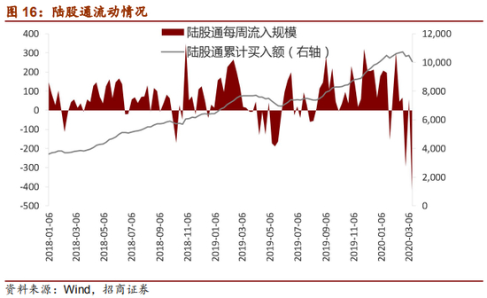 2月末以来外资通过陆股通净流出,近四周周均流出147.6亿元。