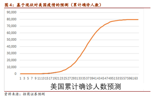 美国疫情展望:美国初期确诊人数增长缓慢的重要原因是检测数量太低,因而为后期孕育了较大风险,特朗普政府迟迟不能正视疫情,意图采取减税等不对症措施处理疫情,造成了时间延误;3月9日以来美国新增病例数快速上升,截至北京时间3月14日上午9时,美国境内新冠肺炎确诊病例已达2028例,死亡43例,随着加大检测力度、推进免费检测,预计美国新增确诊人数还将进一步上升。基于目前疫情的发展和部分假设,我们用logistic方法估算显示,美国累计确诊的峰值预测为8万人,约一个半月后出现,新增确诊人数的峰值预测约在2-3周后出现。而美国联邦政府首席传染病专家表示,美国的新冠肺炎疫情对日常生活的影响可能会持续长达8周或以上。