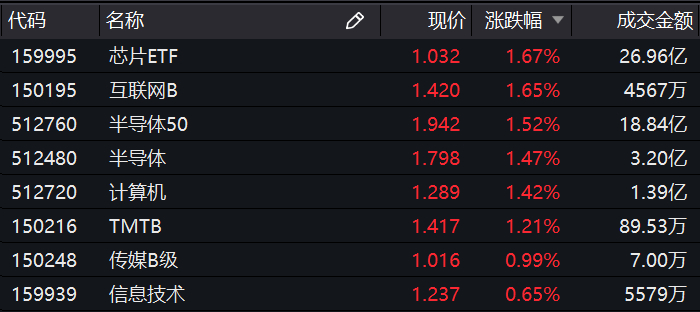 场内基金方面,芯片ETF、半导体50(512760.SH)、半导体(512480.SH)以及计算机(512720.SH)等涨幅均超1%。