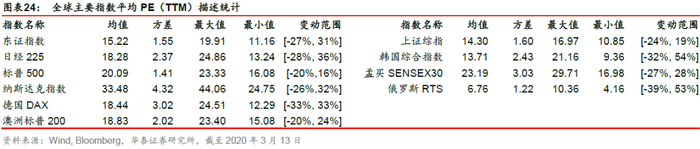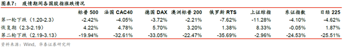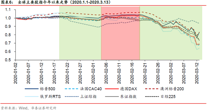 1月20日新型冠状病毒人传人的特性得到确认,各国股市受疫情影响均开始下跌。中国疫情首先爆发,A股领跌疫情的第一阶段,上证综指一度跌至2746点,相对1月20日跌幅为11.28%,其余各国股指跌幅大多在2%到5%之间,俄罗斯RTS指数下跌7.62%。随着中国疫情逐渐好转,海外疫情尚未大面积爆发,全球股市经历了一段时间的恢复期。2月3日至2月19日期间各国股指呈现一定幅度的回升。2月19日之后,国内疫情得到相对有效的控制,上证综指相对抗跌;随着全球疫情的迅速蔓延,主要发达国家股指均大幅下跌。截至3月13日,标普500下跌19.94%,德国DAX指数下跌33.05%,相对欧美而言,日本股市跌幅较小,东证指数下跌24.53%,日经指数下跌25.51%。