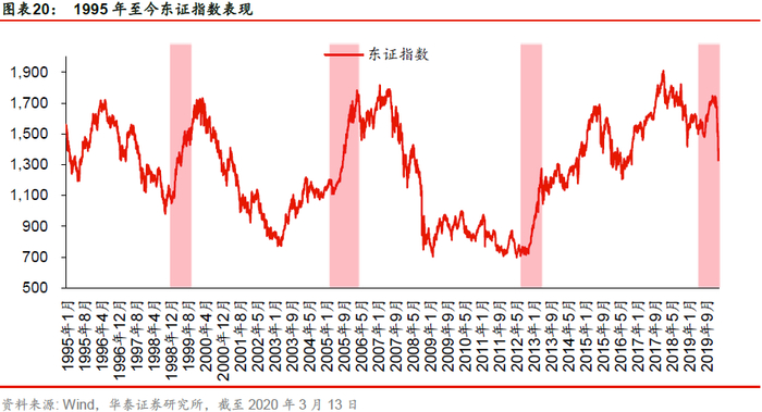 从历史数据来看,我们选取1995年至今东证指数收盘价进行研究。截至2020年3月13日,东证指数收盘点位为1327.9,过去六十天内的回撤为24.00%,挑选如上历史上回撤相似的时期,可以发现,在出现较明显下跌之后,反弹往往较大,长时间持续下跌的可能性较小,这一观察同样佐证了上文的直观结论。