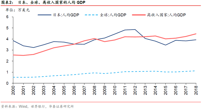 2018年日本人均GDP大约为4万美元,属于高收入国家行列,远高于全球人均GDP1.1万美元。