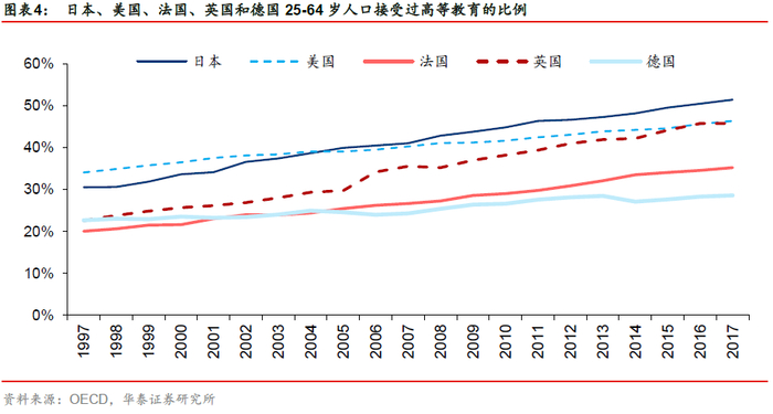 日本拥有世界领先的教育水平,2017年接受高等教育的人数占比约为51%,而英美在同期只有46%,法国为35%,德国为29%。近年来这一比例仍然保持上升趋势,超过半数的高等教育普及率也为日本科技和经济的发展奠定了坚实基础。