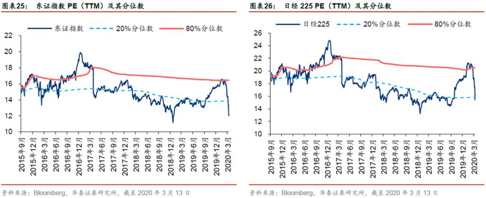 从东证指数和日经225指数的历史估值水平上看,自2017年以来,两指数的PE多数时间位于20%分位数下方,说明指数长时间被低估。2019年9月之后东证指数和日经225指数估值呈现上升趋势,但随着年初疫情的爆发又开始下跌。在2020年3月,两指数的PE重新降至20%分位数以下,说明当下日本市场被低估可能性较大,具有较大的上升空间。