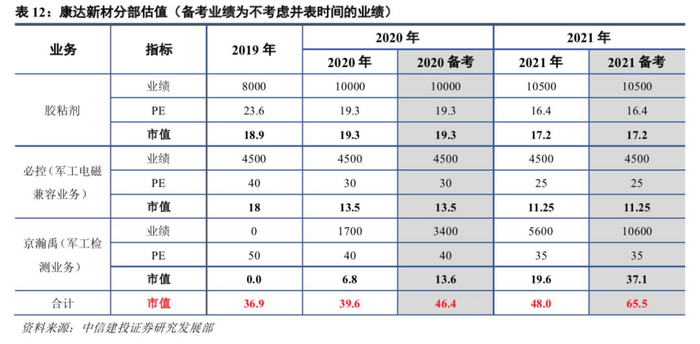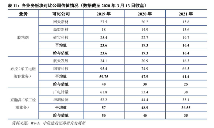 胶粘剂业务选取回天新材、高盟新材和硅宝科技作为可比公司,采取三家公司的平均估值作为康达新材胶粘剂业务的目标估值;军工电磁兼容业务选取航天发展、国睿科技作为可比公司,考虑到必控科技体量较小、且未来两年增速有限,在平均估值的基础上给与一定的折价,20、21年分别给与30和25倍的目标估值;军工检测业务选取广电计量、华测检测作为可比公司,考虑到京瀚禹业务体量较小,在平均估值的基础上也给与一定的折价,20、21年分别给与40和35倍的目标估值。