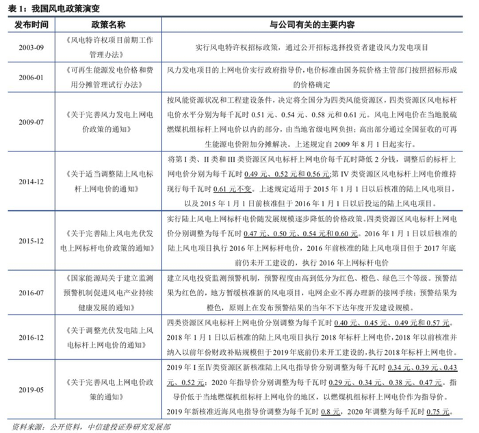 ①2010年以前:2003年发改委出台《风电特许权项目前期工作管理办法》,实行风电特许权招标政策,2009年《关于完善风力发电上网电价政策的通知》,按风能资源状况和工程建设条件将全国分为四类风能资源区,风电标杆电价水平分别为每千瓦时0.51元、0.54元、0.58元和0.61元,2009和2010年我国风电新增装机量实现高速增长。2010年我国新增风电装机容量世界第一,累计风电装机容量超过美国,成为世界风电装机第一大国。