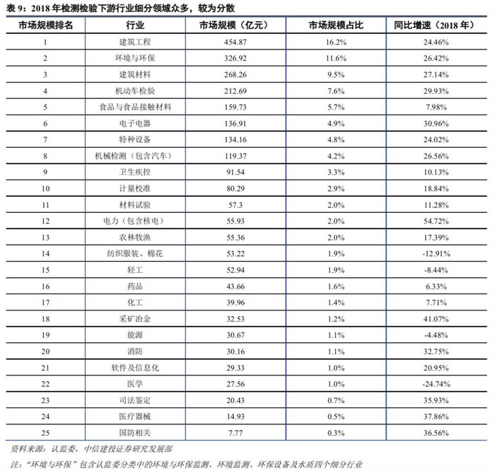 检测行业下游行业分散,几乎覆盖国民经济各行业,2018年前五大细分领域为建筑工程(454.87亿元)、环境与环保(326.92亿元)、建筑材料(268.26亿元)、机动车检验(212.69亿元)和食品及食品接触材料(159.73亿元),前五大领域占市场总规模约50%。京瀚禹所在的军工检测行业在认监委的行业分类中并未单独列出。