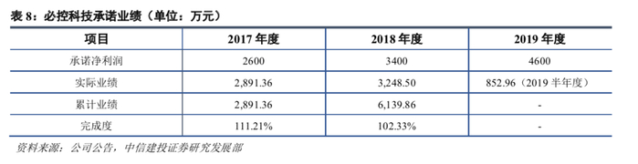 2017-2018年必控完成业绩承诺,2019半年度业绩853万元,当年业绩承诺为4600万元,军工客户第四季度付款较多,具有较为明显的季节效应,因此全年业绩完成情况仍需观察。收购必控使得公司形成3.28亿元的商誉,军用产品一旦占领了新品开发市场,只要按研发阶段跟进服务,基本可以获得后期工程型号持续供货的市场,我们预计必控科技能够保持稳定的发展。