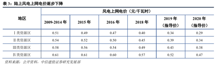 ③2014-2015年:2014年12月发改委《关于适当调整陆上风电标杆上网电价的通知》,将第I、II和III类资源区风电标杆上网电价调整为每千瓦时0.49元、0.52元和0.56元,第IV类资源区维持每千瓦时0.61元不变。规定适用于2015年1月1日以后核准的陆上风电项目,以及2015年1月1日前核准但于2016年1月1日以后投运的陆上风电项目。补贴退坡导致抢装潮出现,2015年国内风电新增装机量30.75GW,达到历史最高水平。