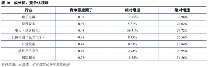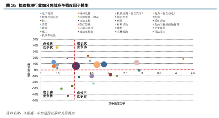 我们以竞争强度因子1.0与相对增长率0%作为分界线,将行业按照竞争格局与成长速度分为四个区间,其中左上角成长优、竞争优区间增速快于行业整体,且竞争强度因子小于1.0,竞争格局好,包含以下细分领域:电子电器、特种设备、电力、机械检测、计量校准、软件信息化。京瀚禹军工电子元器件检测与“电子电器检测行业”有一定重合,赛道优异。