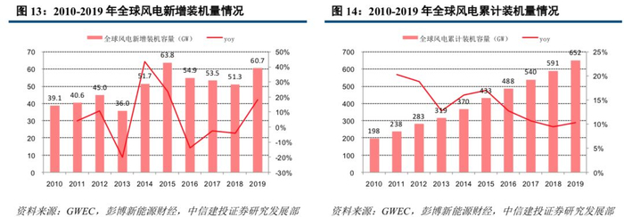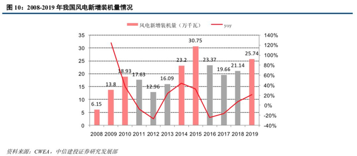 ②2011-2013年:大规模的风电装机导致弃电现象出现,这期间风电新增装机量大体保持稳定,在10-20GW的区间波动;2011和2012年我国风电新增装机17.63GW、12.96GW,同比分别下降6.87%、26.49%。