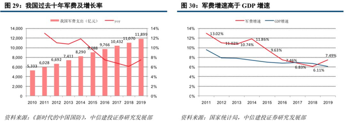 我国军费支出保持稳定较快的增长。根据2019年7月发布的《新时代的中国国防》白皮书,我国军费开支从2010年的5333亿元上升到2017年的11899亿元,CAGR为9.32%,高于同期GDP增速。2019年我国军费预算约1.19万亿人民币,同比增长7.5%。