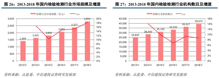 2018年我国检验检测行业市场规模2810.5亿,2013-2018年CAGR达14.98%,是一个稳定增长的好行业。行业营收规模快速增长的同时,检测机构数目及出具报告数量也在持续增加,2018年全市场共有39472家检验检测机构共出具检验检测报告4.28亿份,检测报告平均单价为657元。
