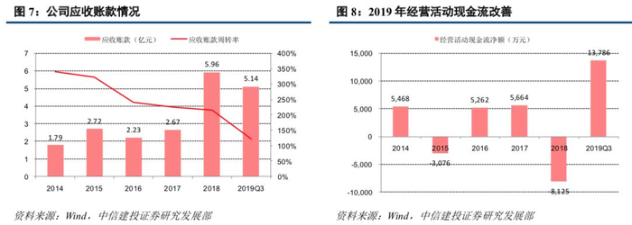 公司销售模式以直销为主,风电叶片胶的客户包括中材科技、明阳风电等,2018年前五大客户销售金额占比35.05%。2018年经营活动现金流净额为-8125万元,主要是营业收入增加导致应收账款增加以及必控科技并表所致,2019年以来公司现金流大幅改善,截至三季报经营活动现金流达1.38亿元,是净利的1.5倍。