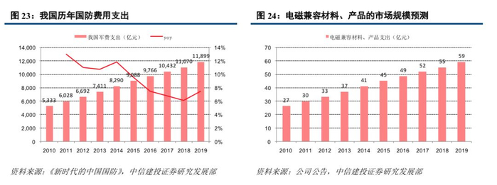 电磁兼容技术技术高、难度大,在国防军工电磁兼容产品市场,有严格的准入限制机制,必须通过严格认证的企业才能进入采购目录,行业进入壁垒较高。出于对国家安全的考虑,国家要求逐步减少对国外电磁兼容相关产品的依赖,本土企业具备进口替代的发展机遇。根据并购预案,电磁兼容材料、产品的支出约占军费的0.5%,由此计算出每年电磁兼容材料、产品市场规模约50亿元。