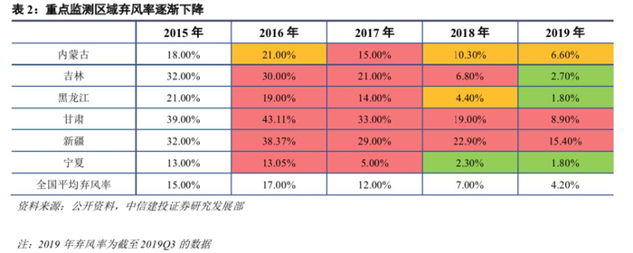 ⑤2019年及之后:重点监测区域弃风率持续下降,2019年吉林、黑龙江、宁夏预警程度由红转绿,风电平价上网倒计时,2019年5月《关于完善风电上网电价政策的通知》带来一轮新的抢装潮,风电建设再次迎来新一轮的高峰。