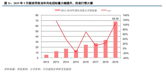 陆上风电2020年抢装基本确定:根据2019年5月的新政,2018年底之前核准的陆上风电项目,2020年底前仍未完成并网的,国家不再补贴,发电集团集中在2019年完成项目招标,预计在2020年完成大规模的装机并网。