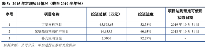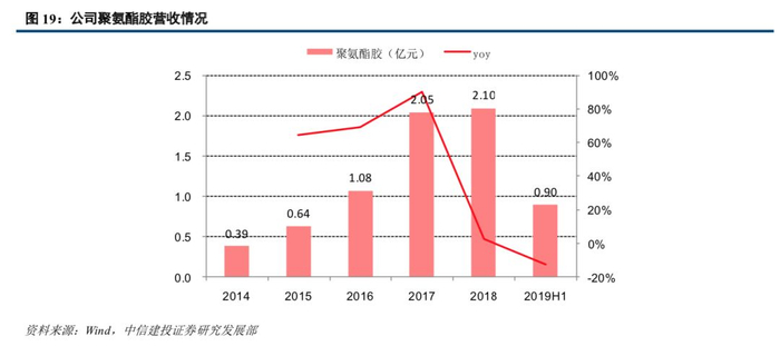 2015年,公司启动非公开发行,拟募资8.5亿元,其中包括1.46亿元的聚氨酯胶扩产项目,项目基建工程于2018年10月31日前已建设完成,目前已投产,为后期公司聚氨酯胶业务的增长打下基础。