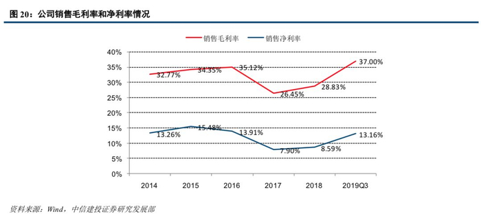 公司的综合毛利率在2017-2018年出现向下的波动,主要是由于原材料价格上涨。2017年综合毛利率26.45%,同比下降8.67%,净利率7.90%,同比下降6.01%,2018年虽有小幅回升但还是维持在低位。