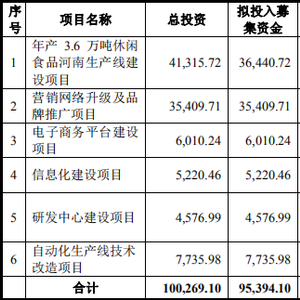 1.年产3.6万吨休闲食品河南生产线建设项目,总投资4.13亿元,拟投入募集资金3.64亿元;2.营销网络升级及品牌推广项目,总投资3.54亿元,拟投入募集资金3.54亿元;3.电子商务平台建设项目,总投资6010.24万元,拟投入募集资金6010.24万元;4.信息化建设项目,总投资5220.46万元,拟投入募集资金5220.46万元;5.研发中心建设项目,总投资4576.99万元,拟投入募集资金4576.99万元;6.自动化生产线技术改造项目,总投资7735.98万元,拟投入募集资金7735.98万元。