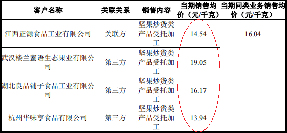 甘源食品2016年对江西正源食品工业有限公司关联交易的销售均价为14.54元/千克,同期,甘源食品对第三方客户武汉楼兰蜜语生态果业有限公司销售均价为19.05元/千克,对湖北良品铺子食品工业有限公司销售均价为16.17元/千克,对杭州华味亨食品有限公司销售均价为13.94元/千克。