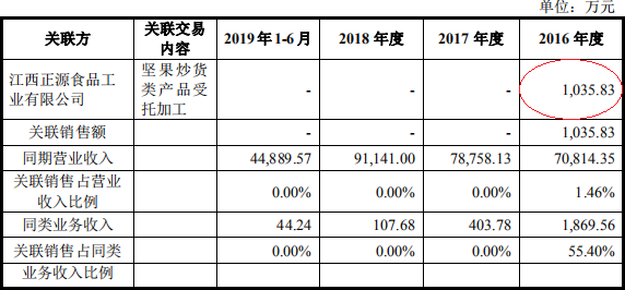招股书显示,甘源食品存关联销售,公司曾于2016年受关联方江西正源食品工业有限公司委托加工坚果炒货类产品,关联销售金额为1035.83万元。