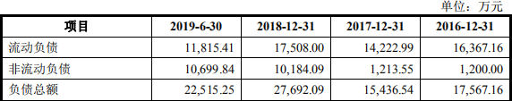 2016年至2019年1-6月,甘源食品负债总额分别为1.76亿元、1.54亿元、2.77亿元、2.25亿元;其中,流动负债分别为1.64亿元、1.42亿元、1.75亿元、1.18亿元,非流动负债分别为1200.00万元、1213.55万元、1.02亿元、1.07亿元。