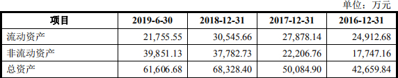 2016年至2019年1-6月,甘源食品总资产分别为4.27亿元、5.01亿元、6.83亿元、6.16亿元;其中,流动资产分别为2.49亿元、2.79亿元、3.05亿元、2.18亿元,非流动资产分别为1.77亿元、2.22亿元、3.78亿元、3.99亿元。